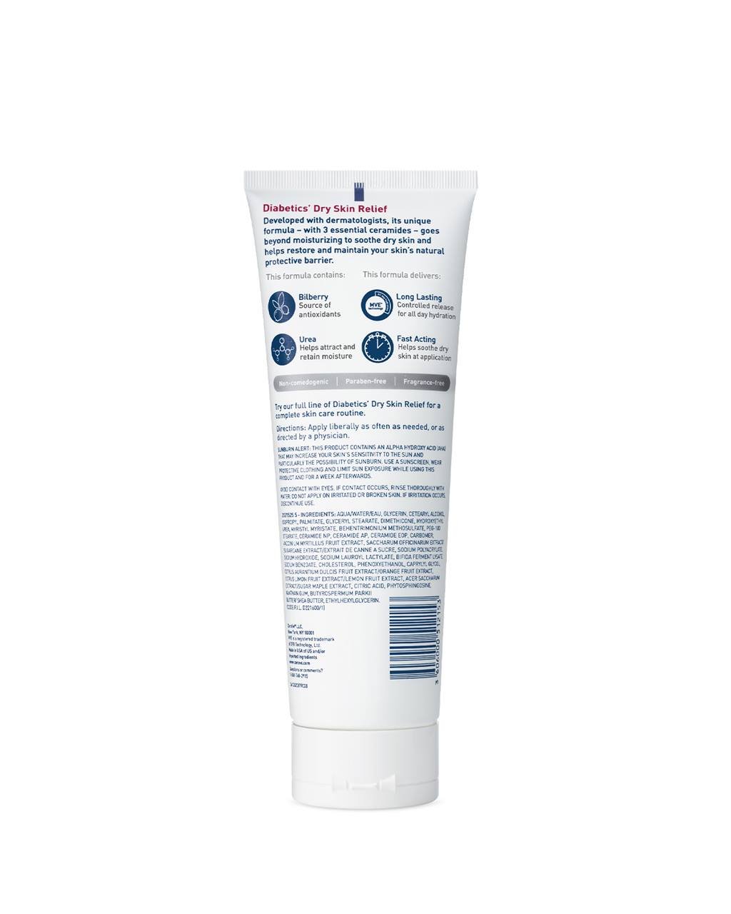 CeraVe Diabetics’ Dry Skin Relief Moisturizing Cream was developed with dermatologists to provide soothing 48-hour hydration for dry skin, and has three essential ceramides to help restore the skin’s protective barrier, urea to help draw moisture from the environment into your skin and bilberry to help provide antioxidant benefits.